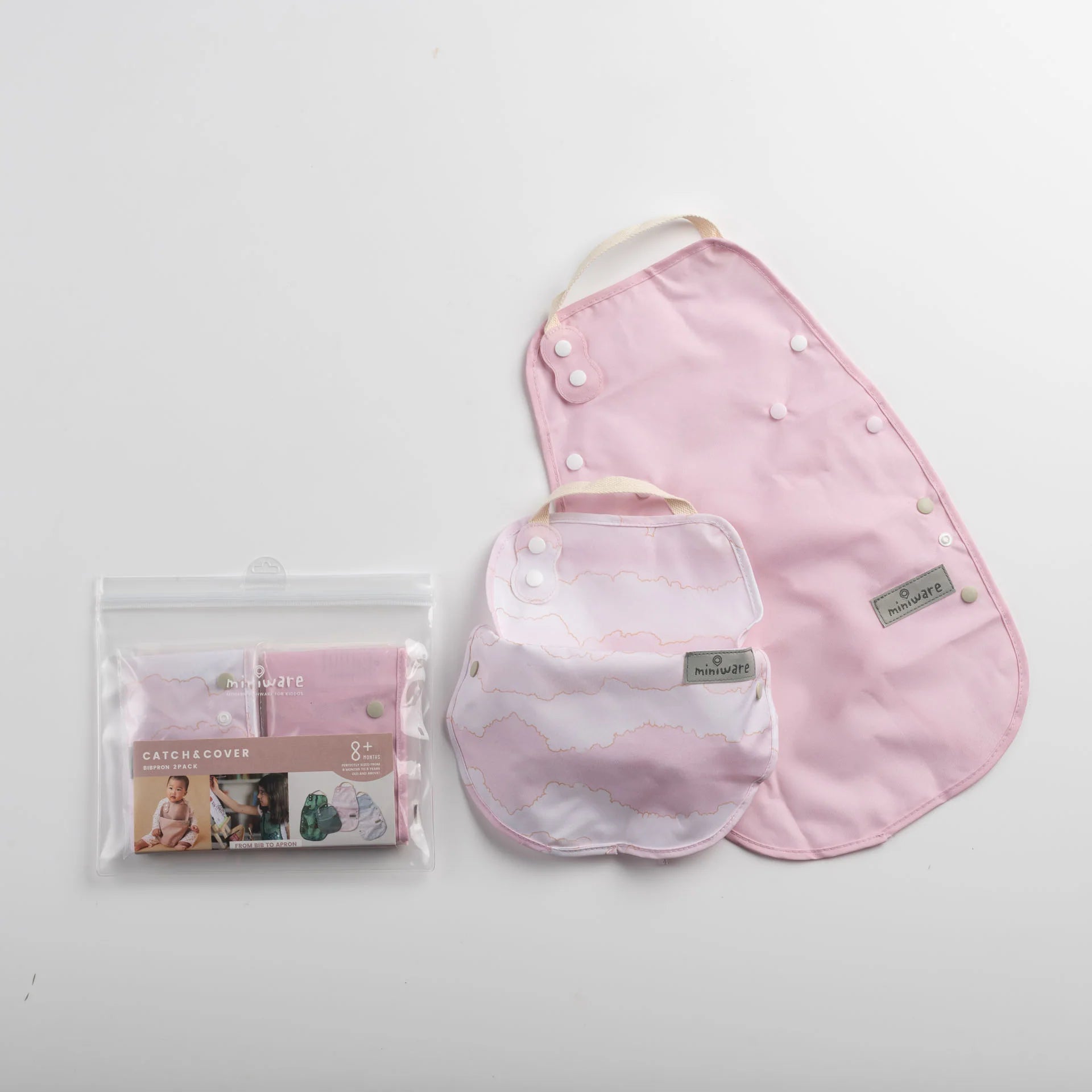 Transform the Catch & Cover as a bib for meals and as an apron for activities like crafts, baking, or any other messy moment. Catch & Cover may be used for many different ages and activities. To transform between bib and apron use the color-coded snap system.